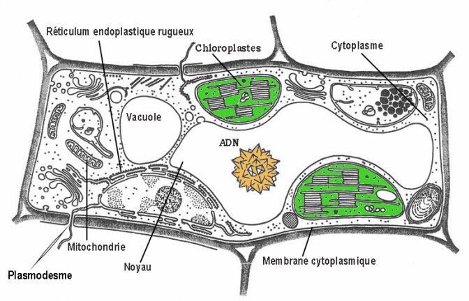 Les chloroplastes responsables de l’activité photosynthétique sont indiqués en vert sur la figure. Les mitochondries sont le siège de la respiration cellulaire. La vacuole se remplit d’eau et participe au maintien en tension de la plante. Le noyau contient l’ADN.